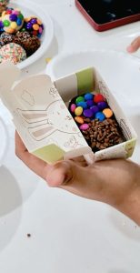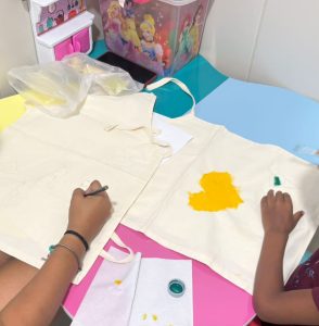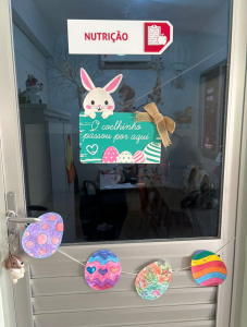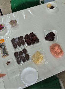 Além da oficina, também houve pintura em aventais e desenhos com temática de Páscoa, ampliando a vivência lúdica e criativa. Entre um brigadeiro e outro, foram construídas memórias afetivas em meio ao cuidado.